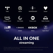 Music Streaming β Supports Amazon Music, TIDAL, Qobuz, HIRESAUDIO, TIDAL Connect, DLNA, and wireless streaming for high-quality online audio playback.